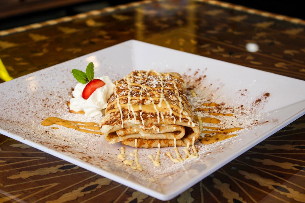 A nutty, buttery sensation! Golden raisins, creamy vanilla custard, and a drizzle of caramel combine to create a rich, indulgent crepe that’s sweet, satisfying, and unforgettable.