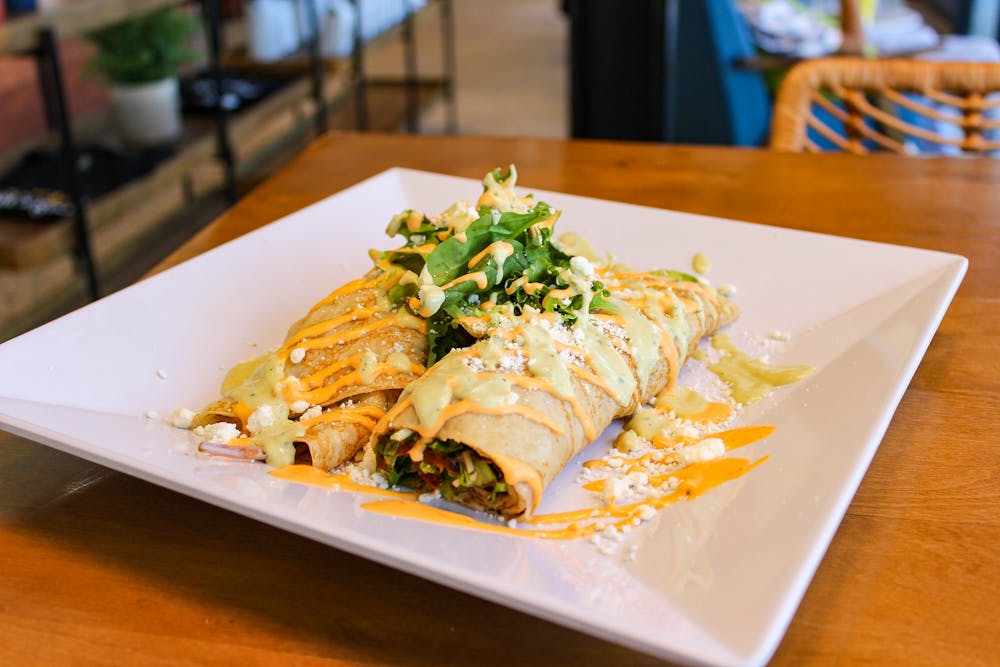 Mediterranean-inspired and bold, this crepe features tender roasted eggplant, oven-dried tomatoes, creamy goat cheese, and a touch of spicy harissa aioli. Every bite is a perfect balance of smoky, tangy, and savory flavors.