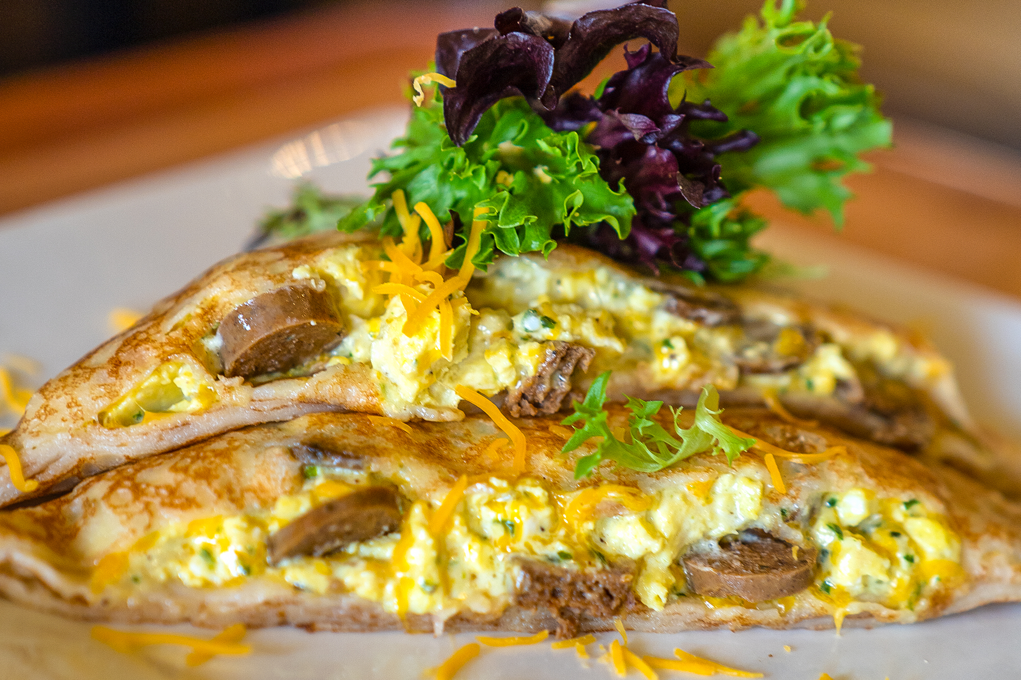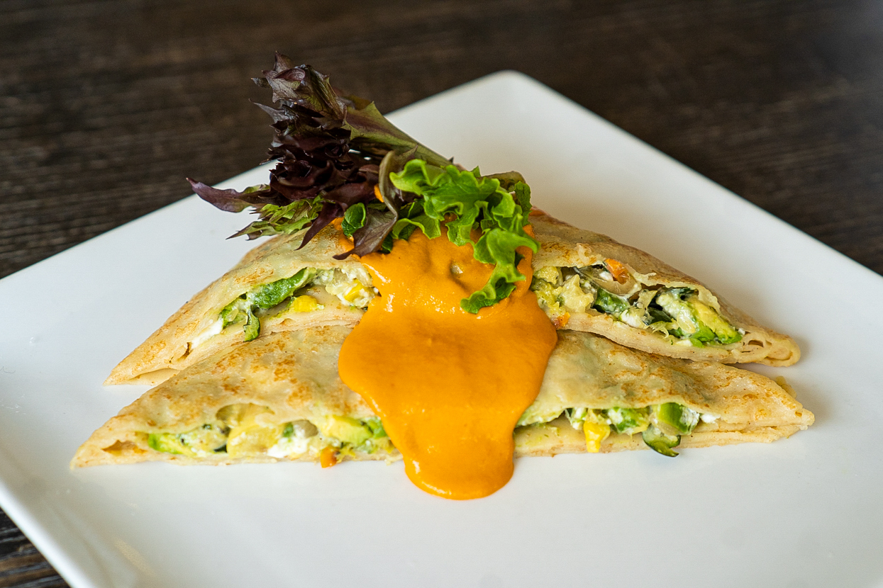 A wholesome, whole wheat crepe loaded with roasted vegetables, oven-roasted tomatoes, sautéed mushrooms, spinach, cheddar cheese, and roasted red pepper pesto sauce. Hearty, nutritious, and bursting with flavor.