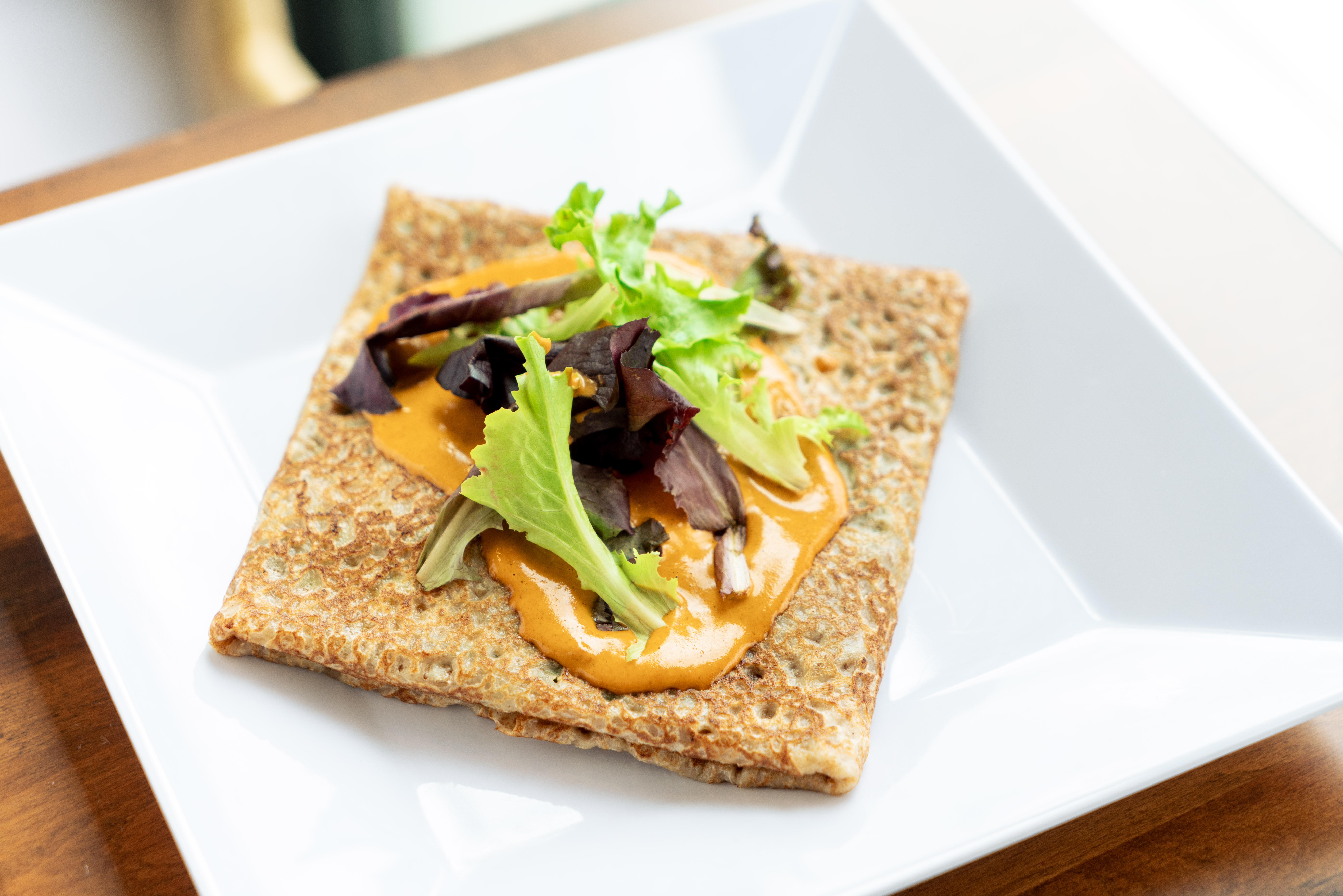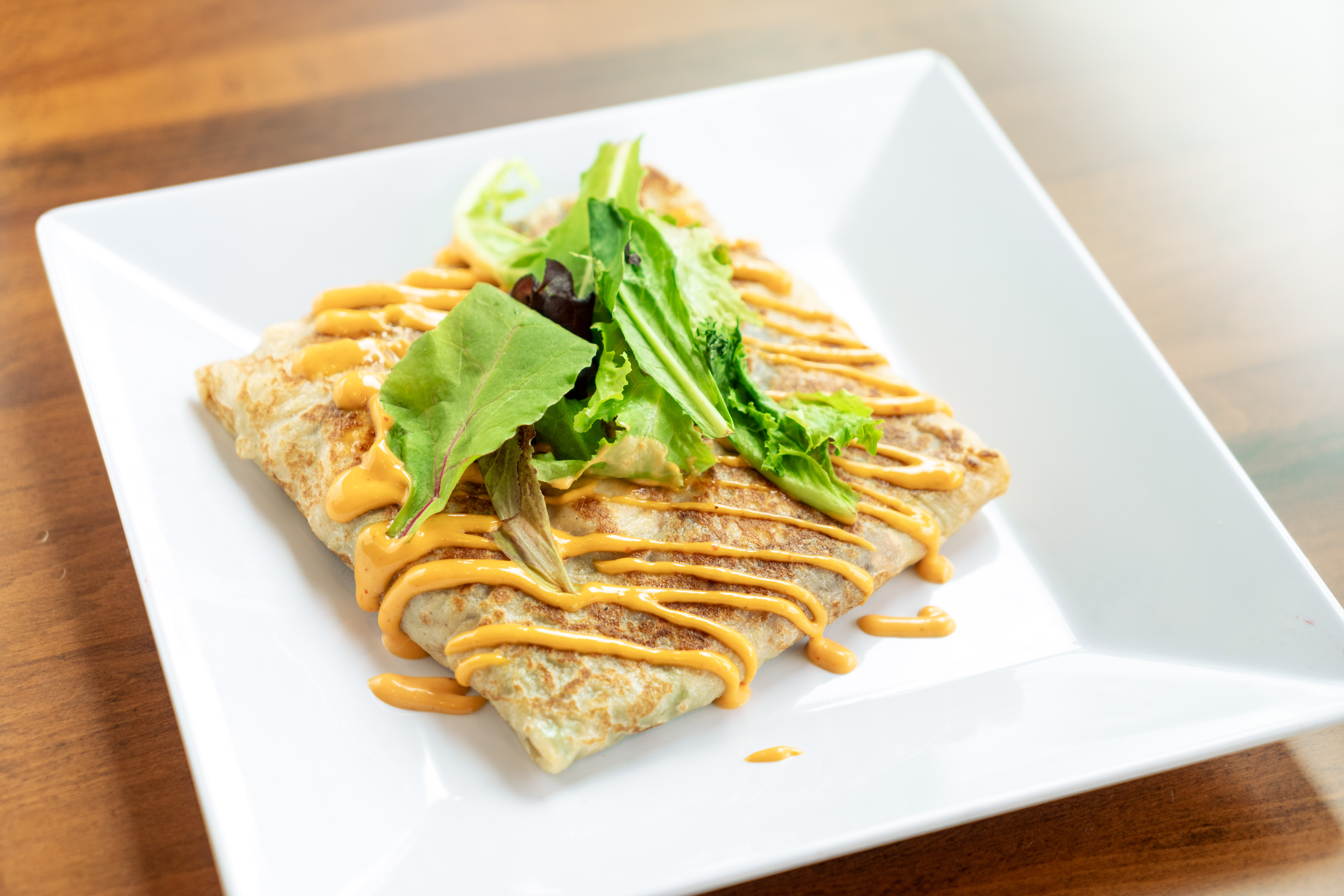 Mediterranean-inspired and bold, this crepe features tender roasted eggplant, oven-dried tomatoes, creamy goat cheese, and a touch of spicy harissa aioli. Every bite is a perfect balance of smoky, tangy, and savory flavors.